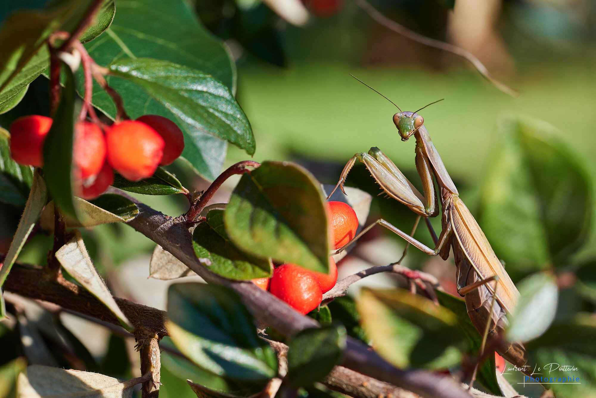 L’occasion de rencontrer Mantis religiosa, la Mante religieuse de nos jardins. Elle profite des derniers rayons du soleil pour se réchauffer. Il suffit alors de bien observer et vous pourrez la photographier facilement. C’est une espèce d’insecte d’une taille impressionnante pour nos contrées, avec une longueur pouvant atteindre 8 cm et qui reste relativement stoïque si votre approche est douce et sans mouvement brusque.
