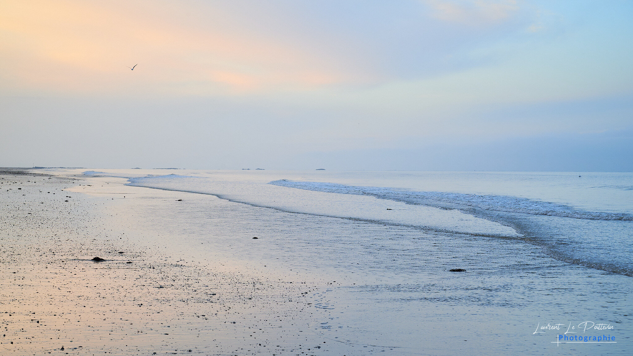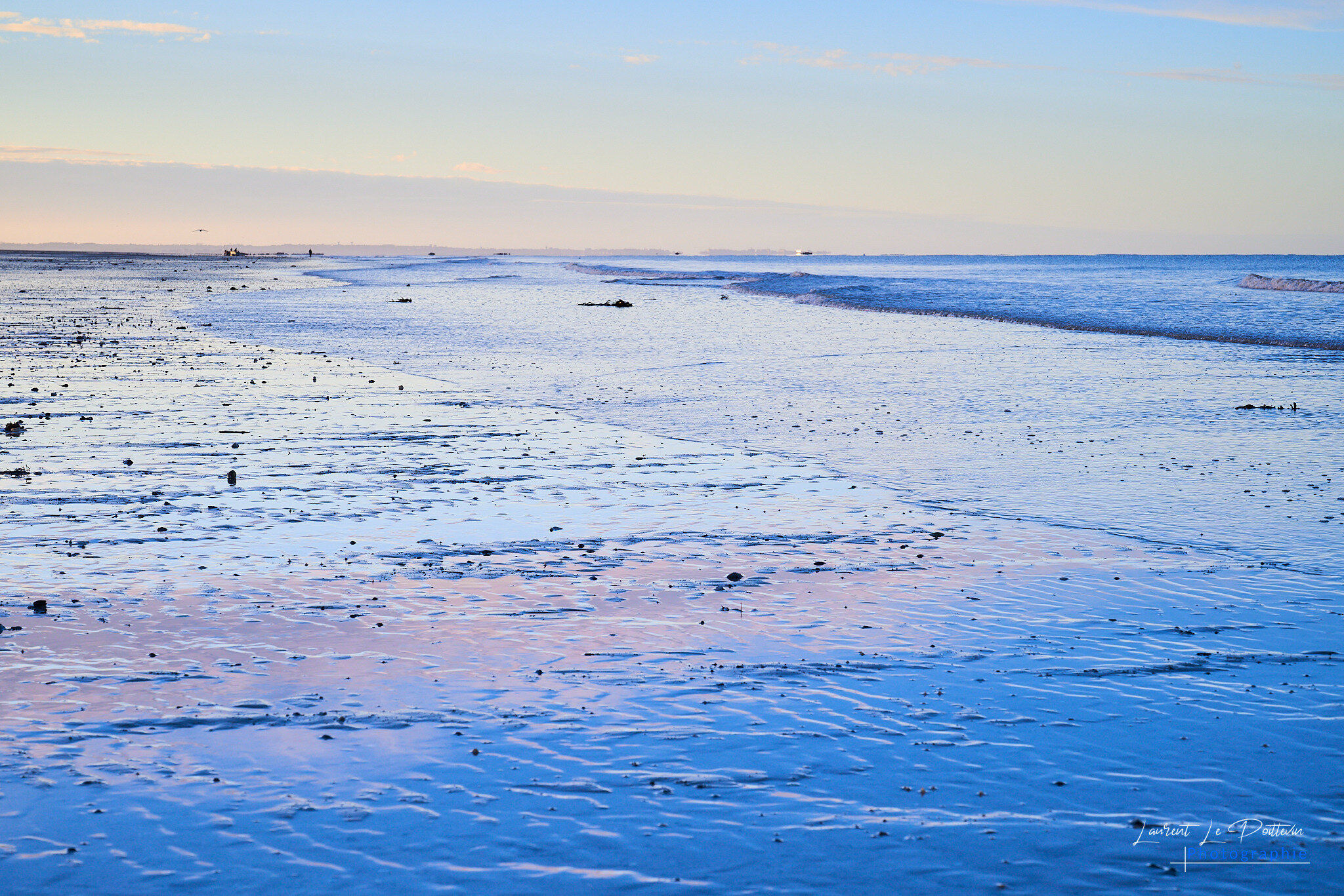 Ce qui m’a particulièrement touché, c’est cette lumière si particulière, ni éclatante, ni terne. Les nuances pastel du ciel se reflétaient sur le sable humide, créant un miroir naturel où ciel et terre se confondaient en une parfaite harmonie.