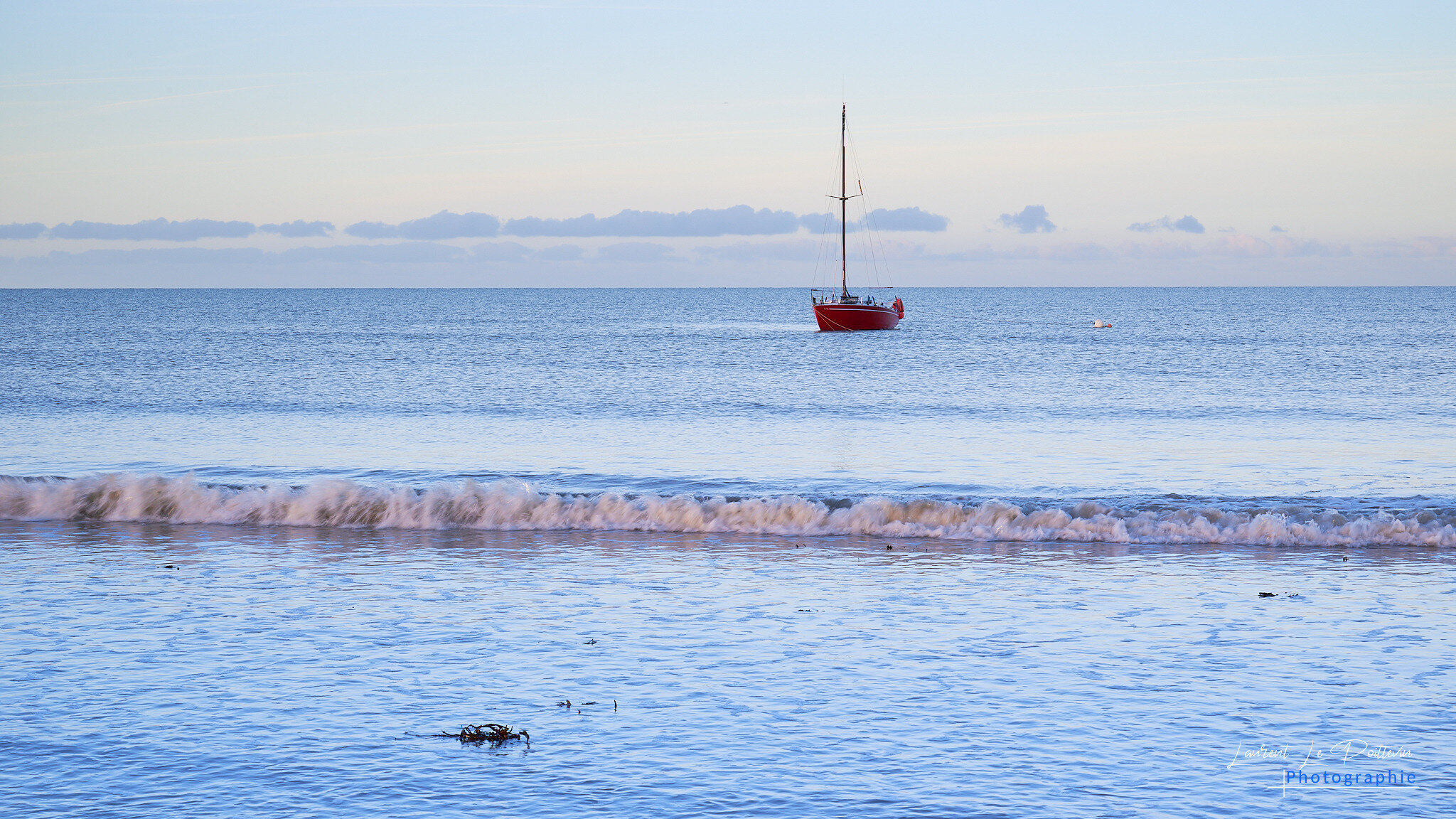 C’est dans la douceur d’un matin d’octobre que j’ai arpenté cette la plage d’Agon-Coutainville, alors que le monde semblait encore endormi. Le ciel normand déployait un camaïeu délicat – des teintes poudrées d’orangé et de rose pâle se fondant graduellement dans un bleu pastel, comme si la nature avait choisi les plus subtiles de ses couleurs pour peindre cette aube. C’était les derniers rayons de soleil avant une longue période de pluie.